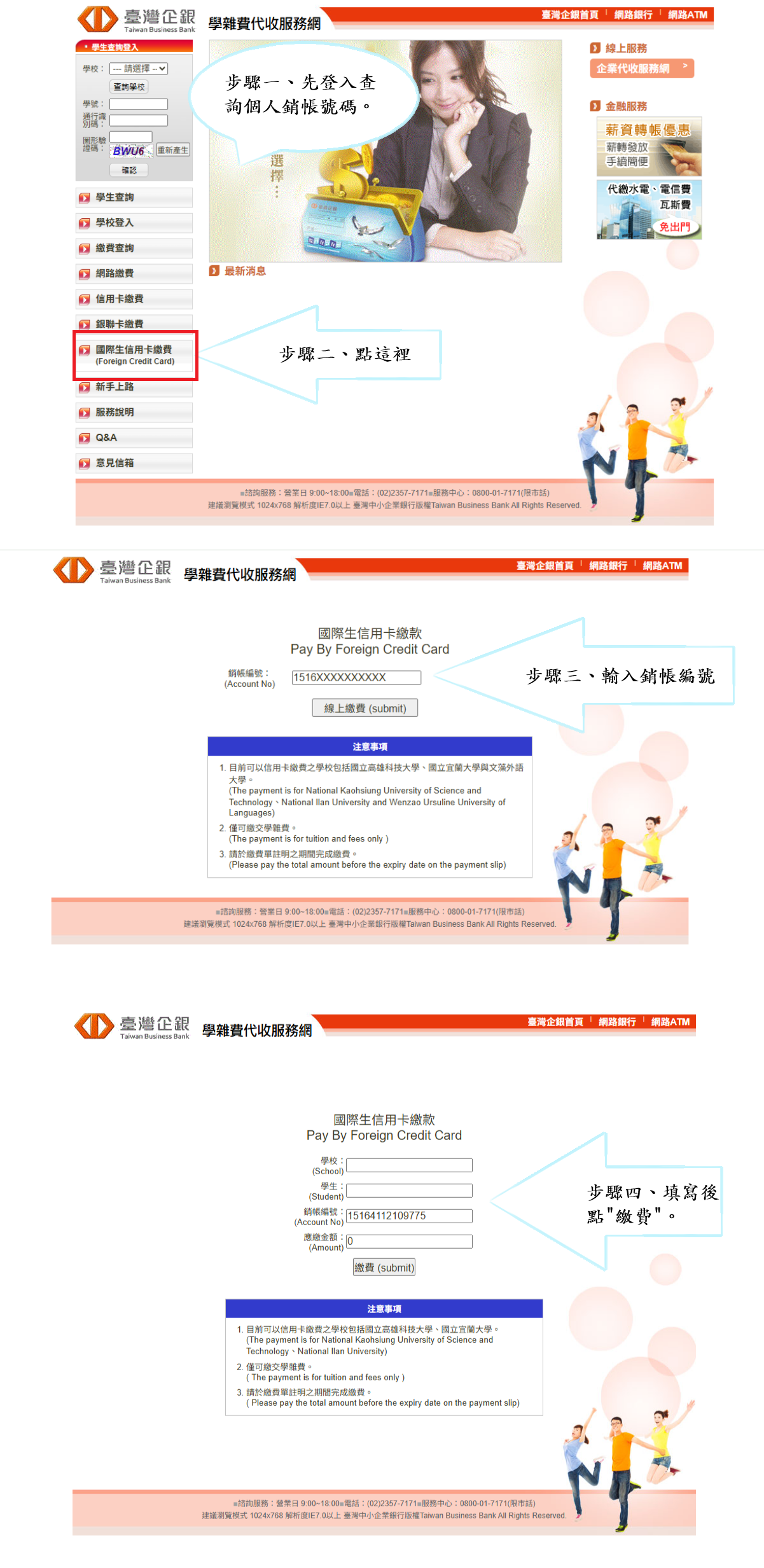 14.【重要】學雜費繳費單下載與繳費說明►【按這裡進入】操作教學 ☆★ 步驟一:前往列印繳費單/線上繳費►[【按這裡進入】臺灣企銀學雜費代收服務網] ☆★ 步驟二:系統登入教學 (必讀!) 進入銀行網站後,請點選**「學生查詢」** 登入帳號:請輸入學生學號 登入通行識別碼:請輸入學生身分證字號 (英文字母請務必大寫) |